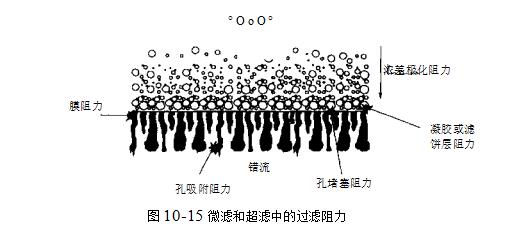 在膜过滤中,对于渗透液的流动有几种阻力由图10-15给出最著名的阻力就是浓差极化阻力.如果膜成功地将悬浮物在其表面截留下来,那么在膜表面和大量进入的悬浮液之间势必会产生浓度梯度.