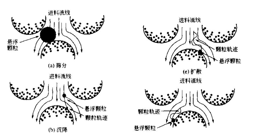 所有澄清过滤技术至少涉及一种下面所列出的机理筛分,沉降,截留,惯性碰撞,扩散,流体动力学相互作用,静电相互作用,双电层排斥作用,范德华力.