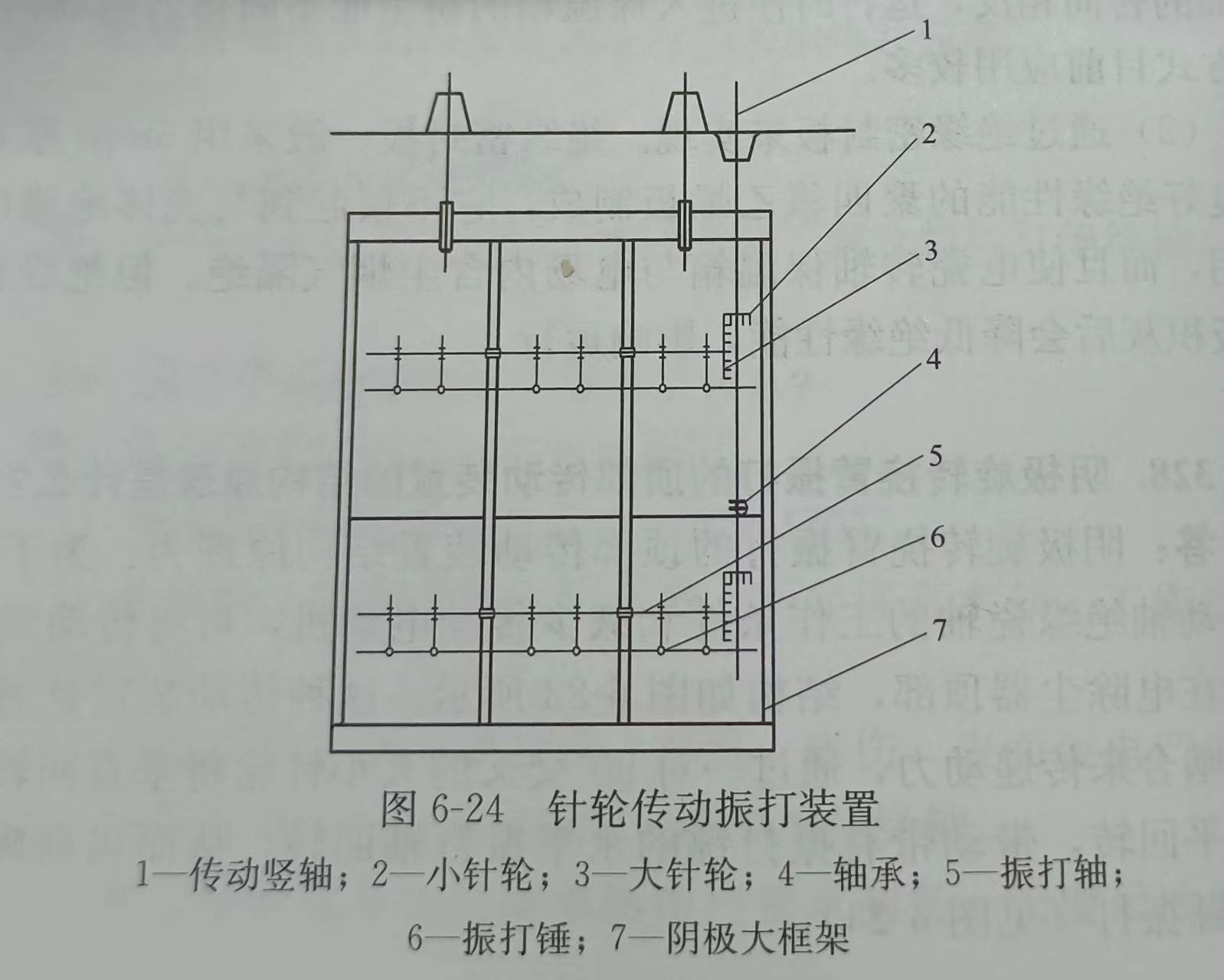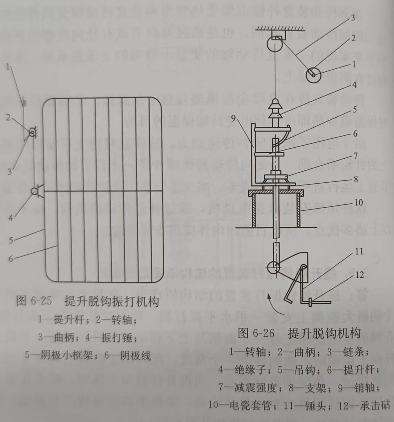 在每个电场或室的一个阴极大框架上安装一根水平振打轴,轴上安装着若干振打锤,在轴的某一处固定着一个曲柄与上下移动的提升杆铰接.