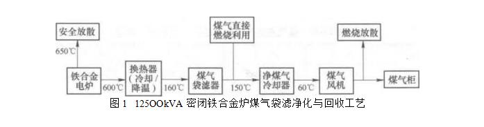 密闭铁合金电炉煤气干法净化荒煤气降温装置釆用三级冷却的形式,第一级为自然冷却降温,第二级为旋风预分离和降温,第三级为煤气快速空冷器.