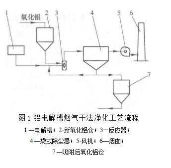 其烟气干法净化工艺流程:各电解槽的烟气汇集在一起进入反应器,同时定量加入新鲜氧化铝,然后进入袋式除尘器.