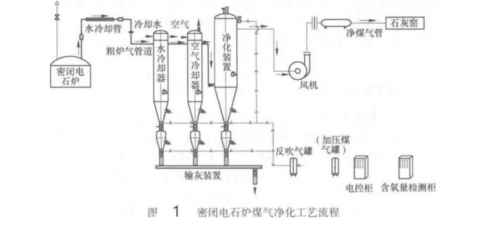 密闭电石炉生产煤气净化工艺流程是:荒煤气先经水冷管道冷却,再经粉尘,焦油沉降器,约50%的粉尘在此除去,再依次通达空气冷却器捕集焦油冷却器将烟气温度降至220?250℃,然后进入袋式除尘器.