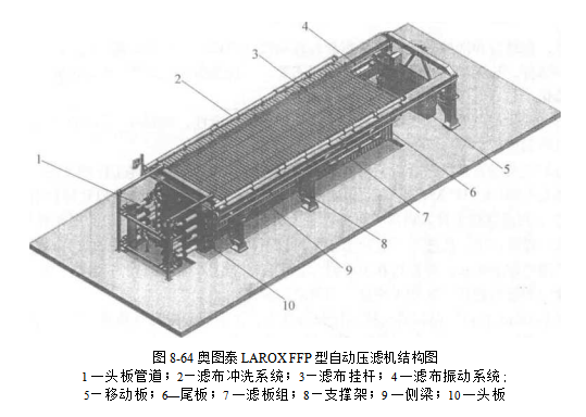 目前的LAROX PF型自动压滤机是一种立式,压榨型滤布全行走式全自动压滤机,该机为单面过滤.