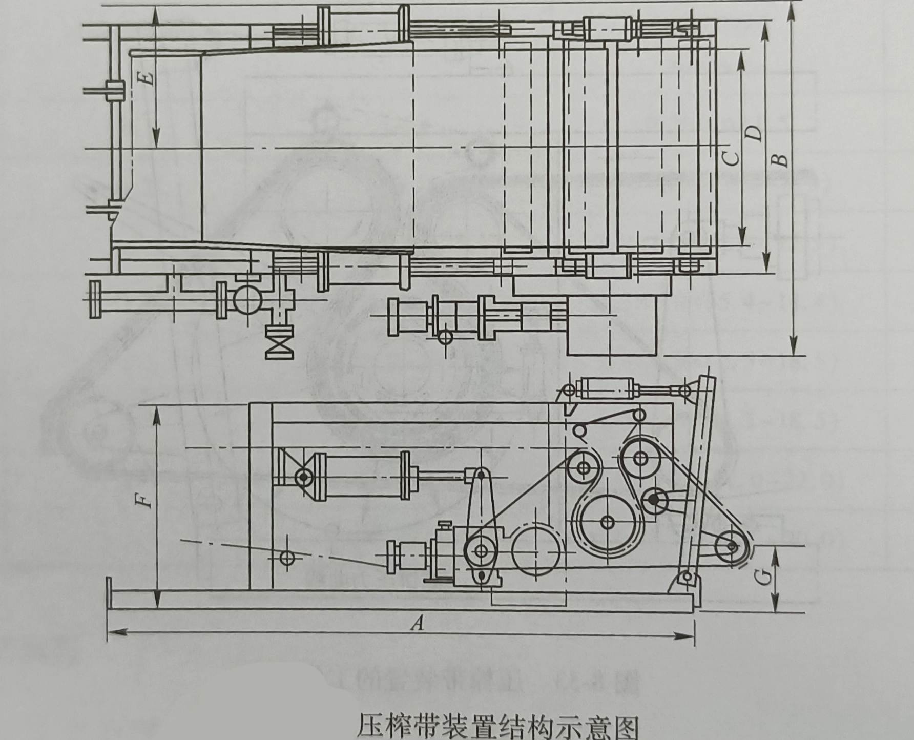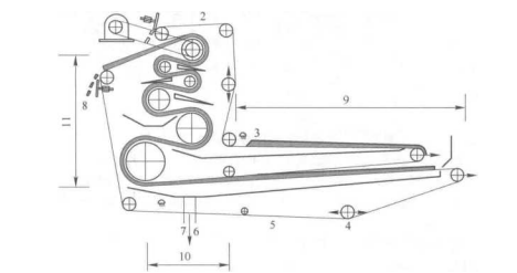 带式压榨过滤机是由两条无端滤带缠绕在一系列顺序排列,大小不等的辗轮上,利用滤带间的挤压和剪切作用脱除料浆中水分的一种过滤设备,又称为带式压滤机.