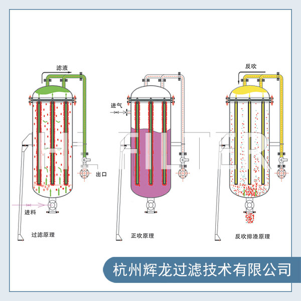 过滤机无需滤饼过滤,对细粘的料液,使得过滤速度一直处于很高的起始通量状态在过滤过程中,一组过滤,一组反吹模式中,过滤机内反吹下来的液渣快速进入过滤机的圆锥底部,并在底部排...