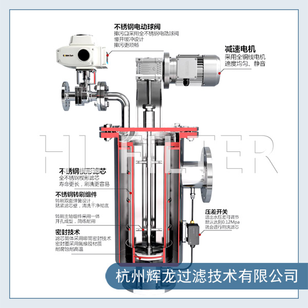 刷式过滤器其内部结构为不锈钢丝刷及不锈钢滤网和传动件组成,由传动电机和电动阀自动完成清洗排污,操作方式为自动运行(亦可手动运行),具有压差和定时自动排污双重功能。当水流经...